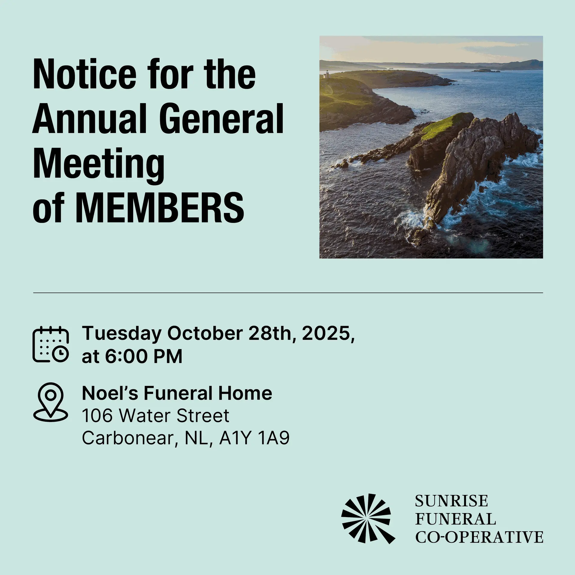 Incorporated in June 2024, Sunrise Funeral Co-operative was created with the goal of becoming the first funeral co-operative in Newfoundland and Labrador. With the help of the Funeral Cooperatives Network, its goal is to become the owner of Noel’s Funeral Homes and Green’s Funeral Home and Services, and as such, provide quality funeral services at a fair price to communities in and around Carbonear, Harbour Grace, Western Bay and Winterton. After the incorporation, a group of 5 community leaders involved in the project from the start stayed onboard and became the interim board of directors. Last April, the inaugural General Meeting of members adopted the by-laws and elected a total of 9 directors on the board. As an Annual General Meeting must be held no later than 4 months after the end of the fiscal year, it is already time for the Annual General Meeting of members.